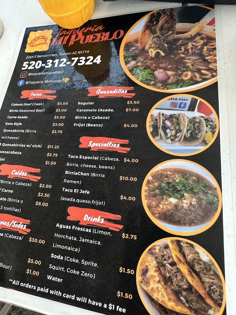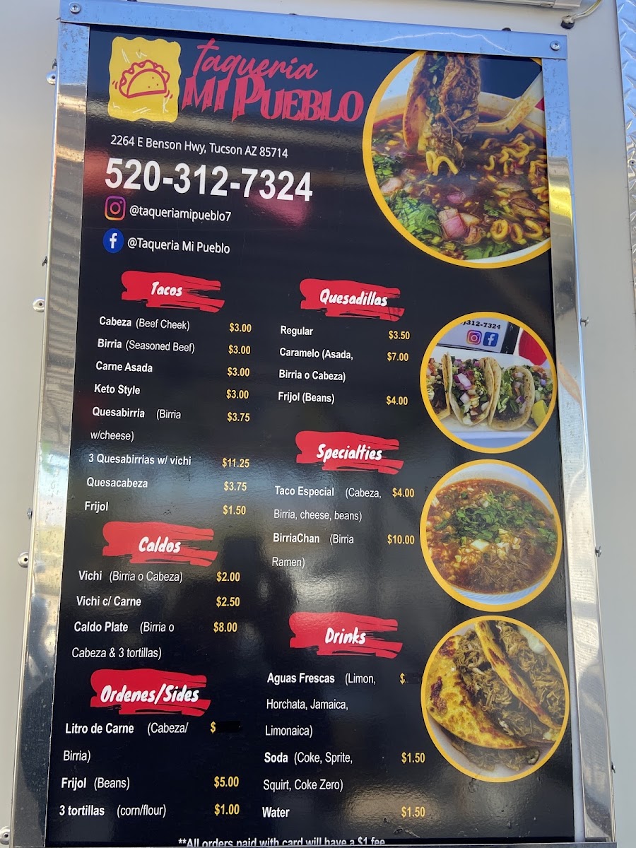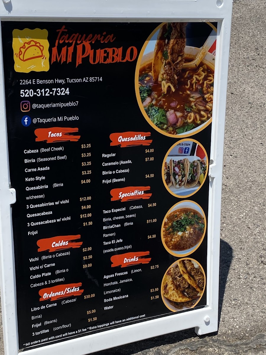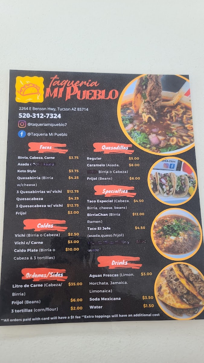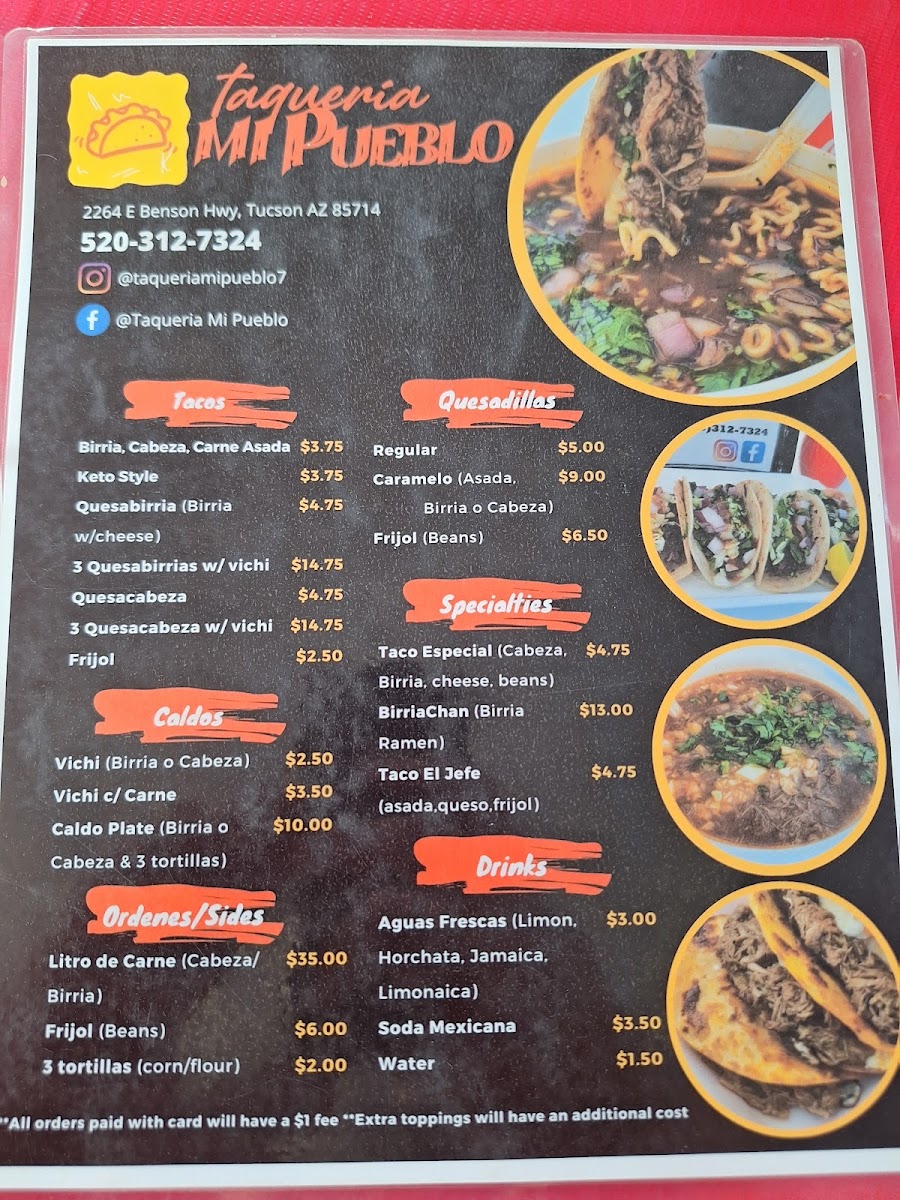 The menu at Taqueria Mi Pueblo offers an enticing variety of authentic Mexican flavors, with standout options that are sure to satisfy any craving. Cabeza Taco & Birria Taco are some of the highlights, combining tender, flavorful meat with the signature richness of birria broth. For those who love a crunchy twist, the Birria Tacos are a must-try, filled with slow-cooked meat and paired perfectly with a tangy salsa.